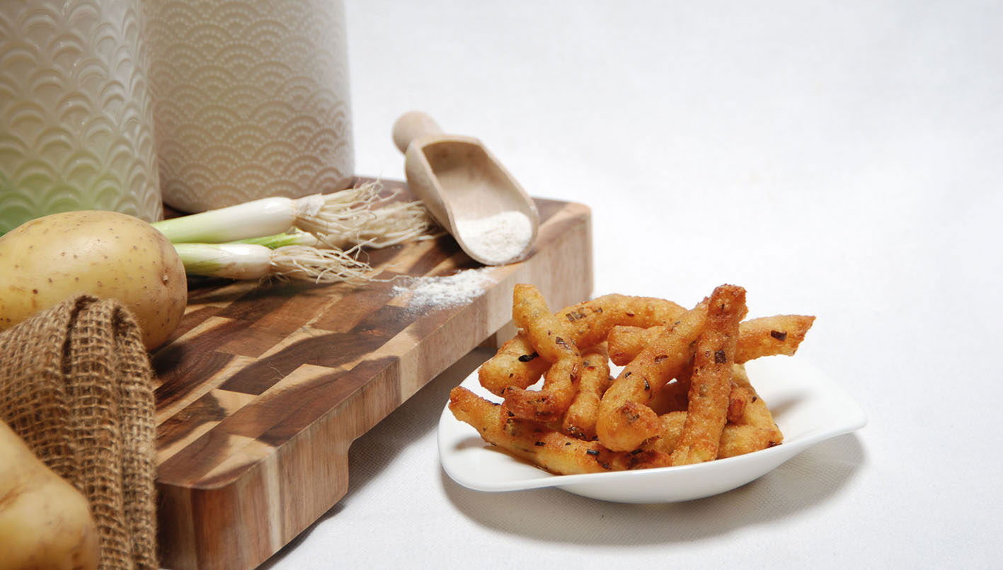 Peal the garlic and chop finely. Heat the butter in a heavy-bottomed saucepan. Gently fry the garlic for 2 minutes. Add ¾ dl of water, salt, pepper and flour, stir well to form a flexible dough and let it gently cook for 1 minute. Add the mashed potatoes and stir well. Flatten the dough into a buttered dish and leave to cool. Chop the spring onion (including the green part) very finely. Knead the cornflour and spring onion into the dough. The dough will be slightly sticky, if it is too sticky, add a little more cornflour. Put into a piping bag or sealable bag. Press into the tip and cut the tip open. Heat the oil to 180°C. Press a 7 cm, thin strip of dough from the piping back into the hot oil and cut the dough strip. Repeat until the dough is finished. Let the strip gently slide into the oil and fry them for about 3-5 minutes until golden brown. Serve immediately!